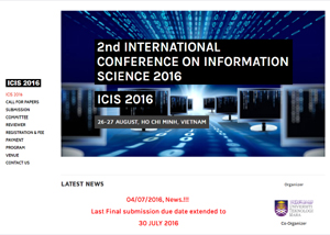 The Faculty of Information Management, Universiti Teknologi MARA (UiTM) and IPN Education Group are pleased to announce the hosting of the 2nd International Conference on Information Science (ICIS 2016). The conference will be held at the Hotel Equatorial Ho Chi Minh City between 26th – 27th August 2016.
