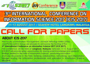 The Faculty of Information Management, Universiti Teknologi MARA (UiTM) and IPN Education Group are pleased to announce the hosting of the 3rd International Conference on Information Science 2017 (ICIS 2017). The conference will be held at Langkawi, Malaysia between 11-12 August 2017.